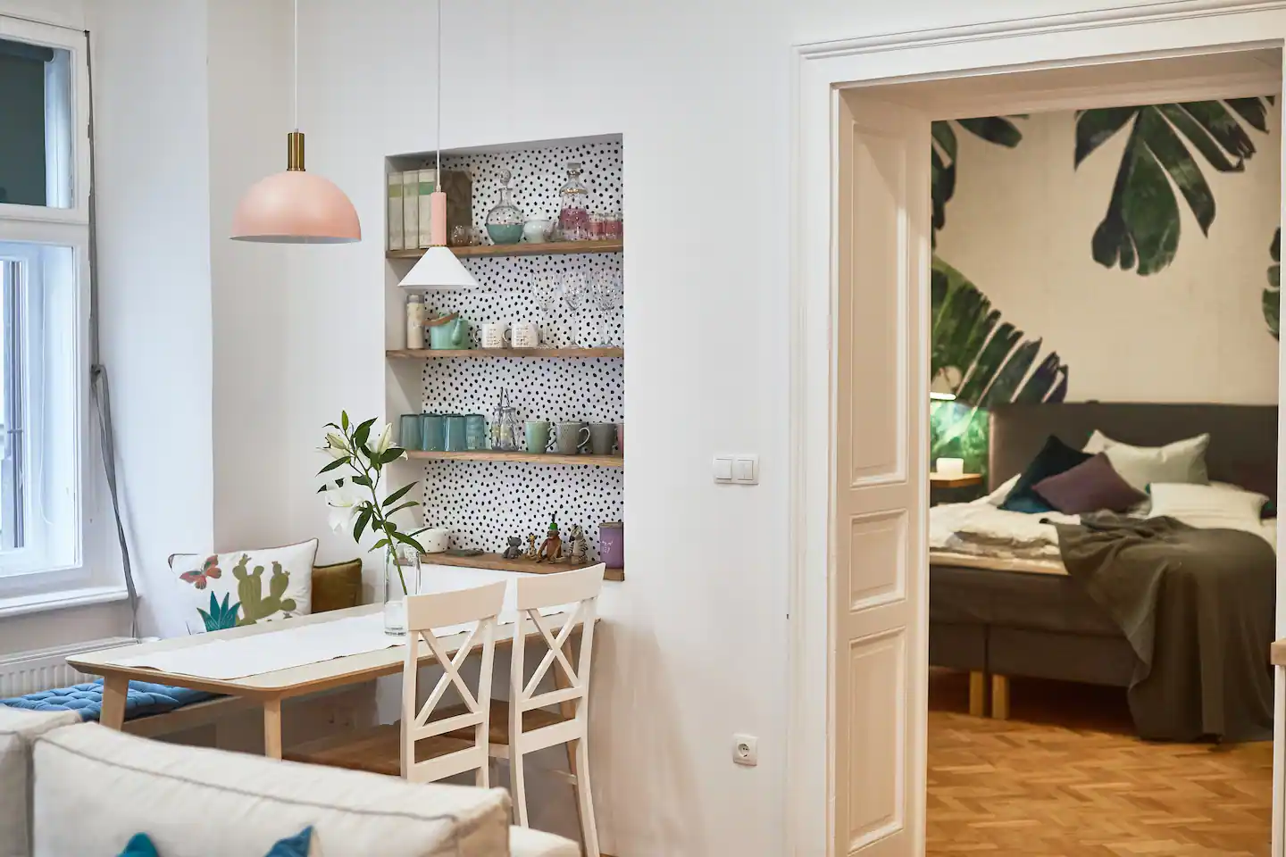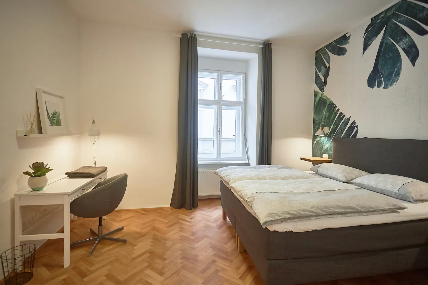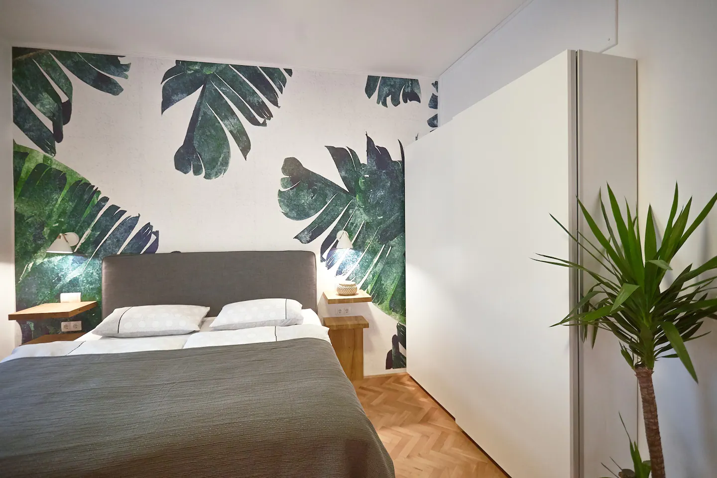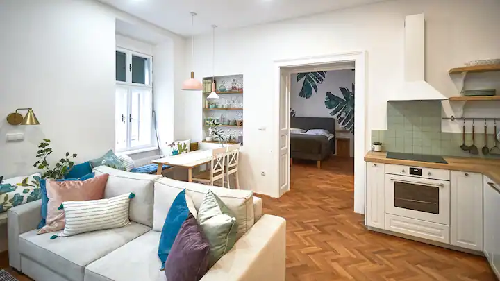 This apartment is meant to make your stay in Maribor unforgettable, not only because it’s nice but also cause you will have your private sauna during your stay here. In the setting of the rooms, we were trying to stick to the original antique structure of the building while the interior design was inspired by the tropical leaf of faraway destinations. All the rooms are very big. The living room, kitchen, and dining area are one big space. We added a mini office space to the bedroom in case you travel for work and a sauna with a bathtub in the bathroom, so you don’t need to travel far to reach the spa. Fresh towels and basic bath essentials, as well as a hair dryer, will be provided upon your arrival.