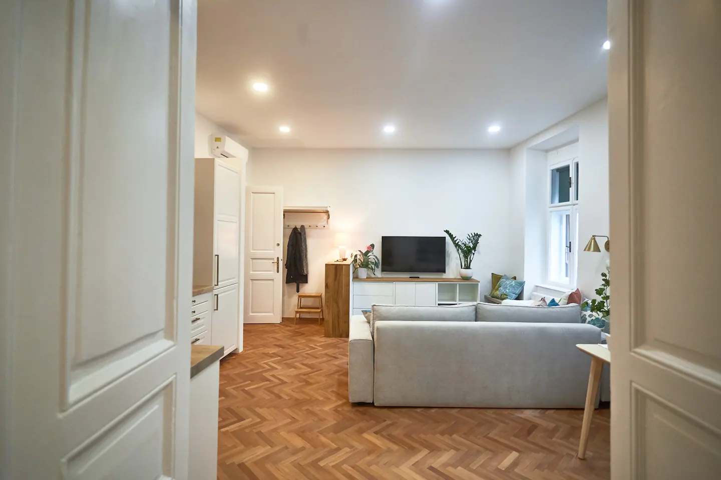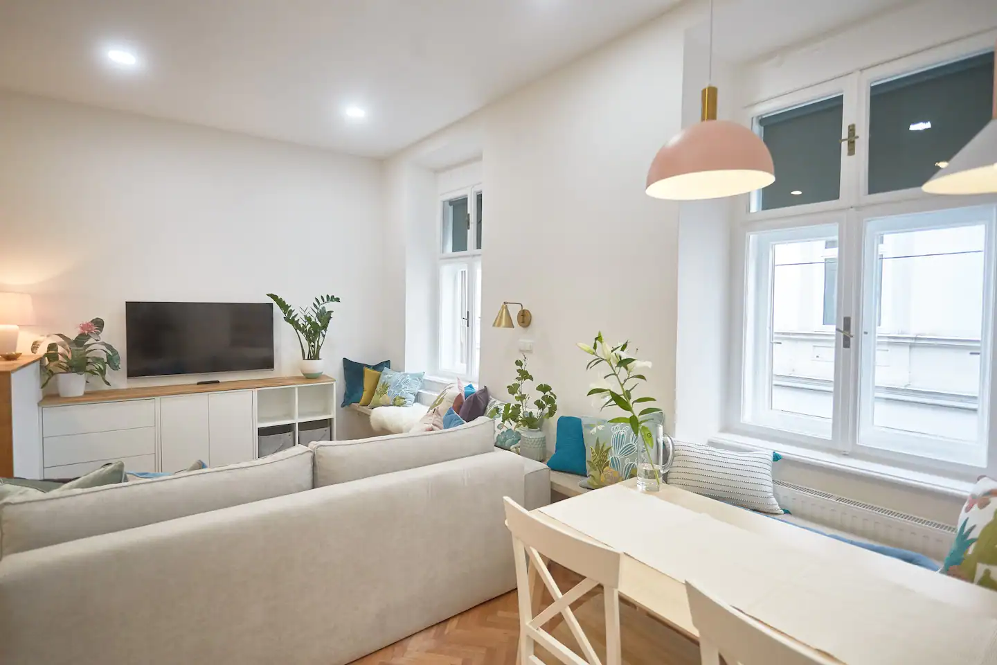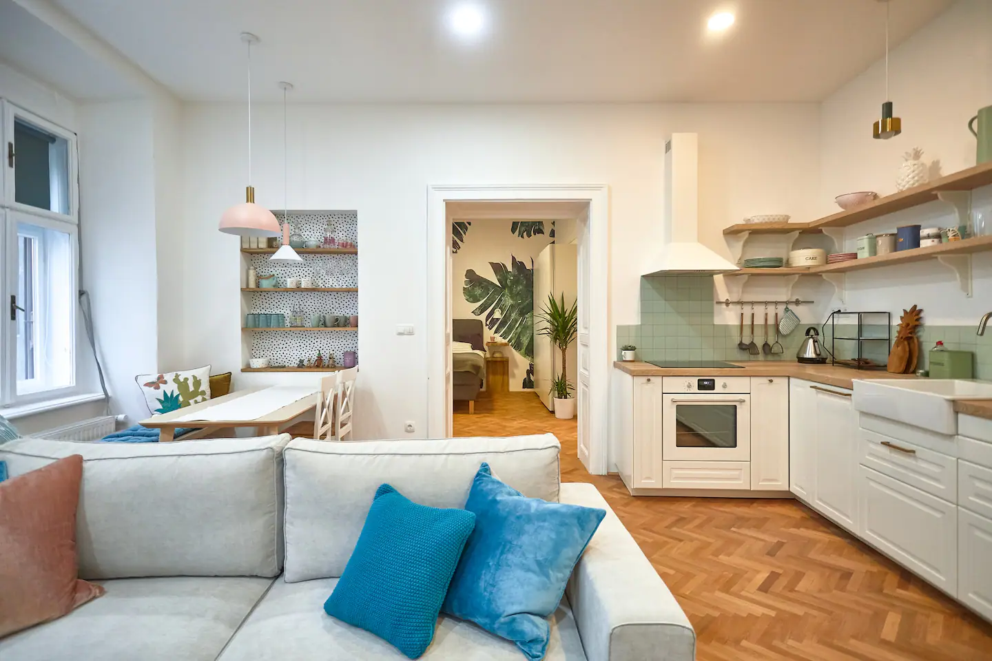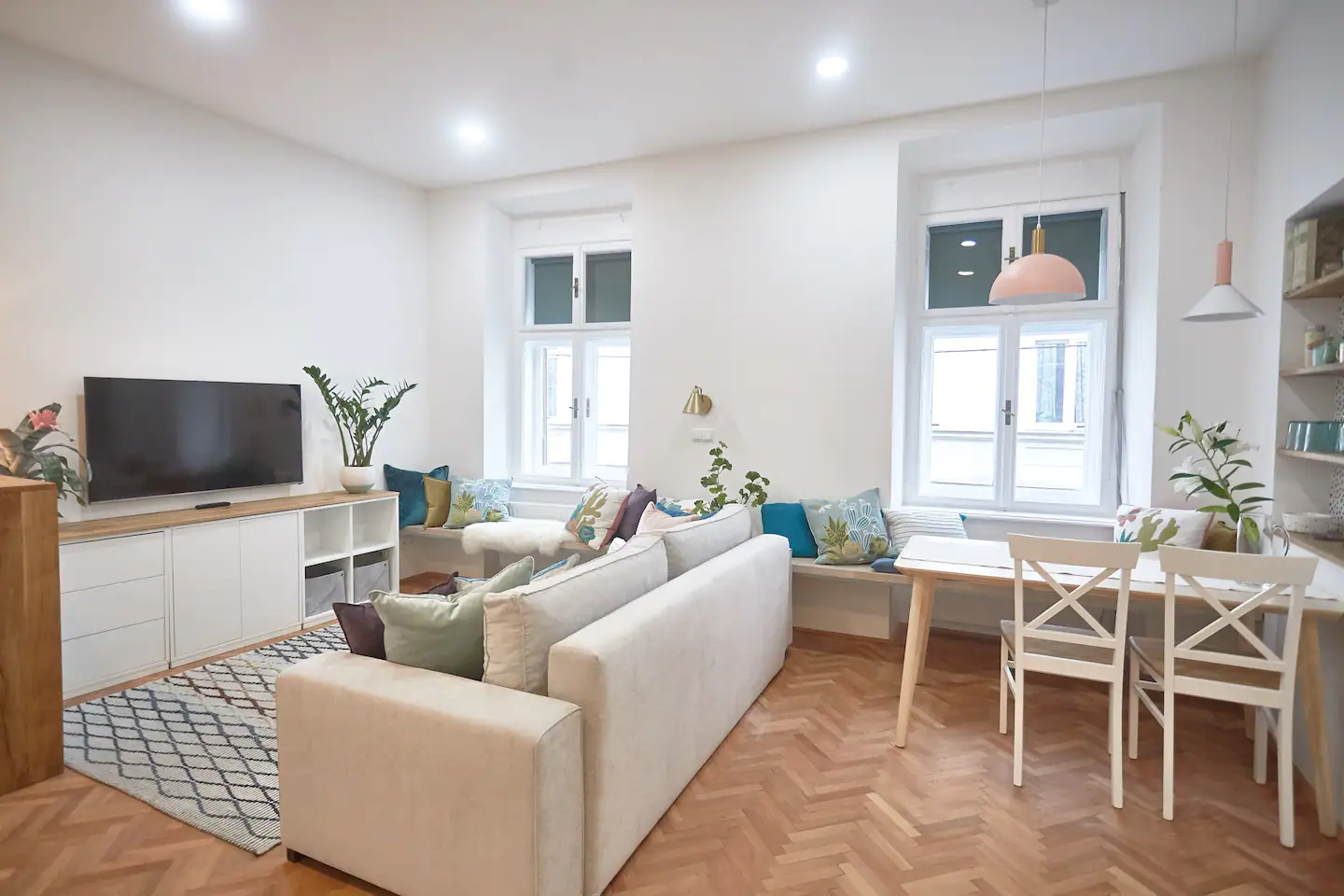 This apartment is meant to make your stay in Maribor unforgettable, not only because it’s nice but also cause you will have your private sauna during your stay here. In the setting of the rooms, we were trying to stick to the original antique structure of the building while the interior design was inspired by the tropical leaf of faraway destinations. All the rooms are very big. The living room, kitchen, and dining area are one big space. We added a mini office space to the bedroom in case you travel for work and a sauna with a bathtub in the bathroom, so you don’t need to travel far to reach the spa. Fresh towels and basic bath essentials, as well as a hair dryer, will be provided upon your arrival.