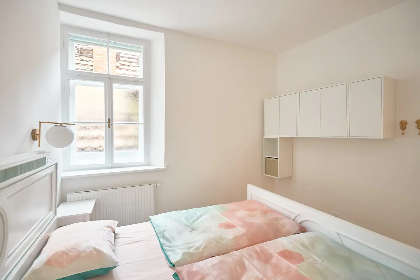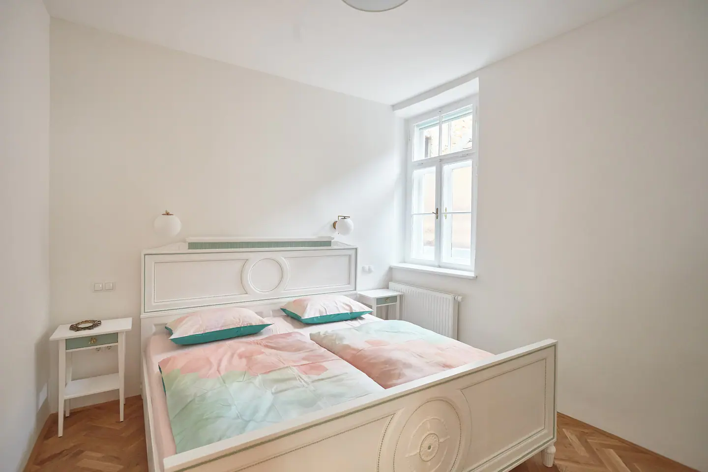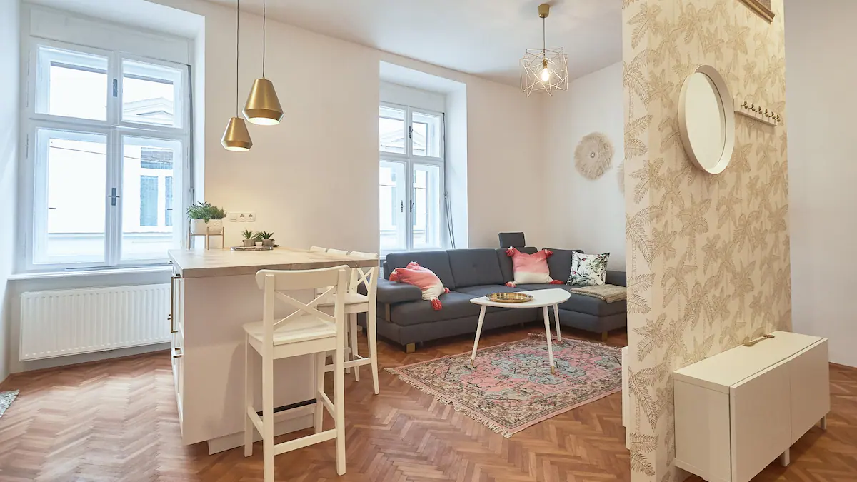 This spacious and cozy apartment has a nicely decorated living room area which is connected to a fully equipped kitchen but slightly separated from it with a bar-like dining space. The very special feature of this apartment is an antique bed that was brought from a small fortress-like house in the suburbs of Vienna. Slide back in time and sleep like a Lord in this very unique end enormously big bed.