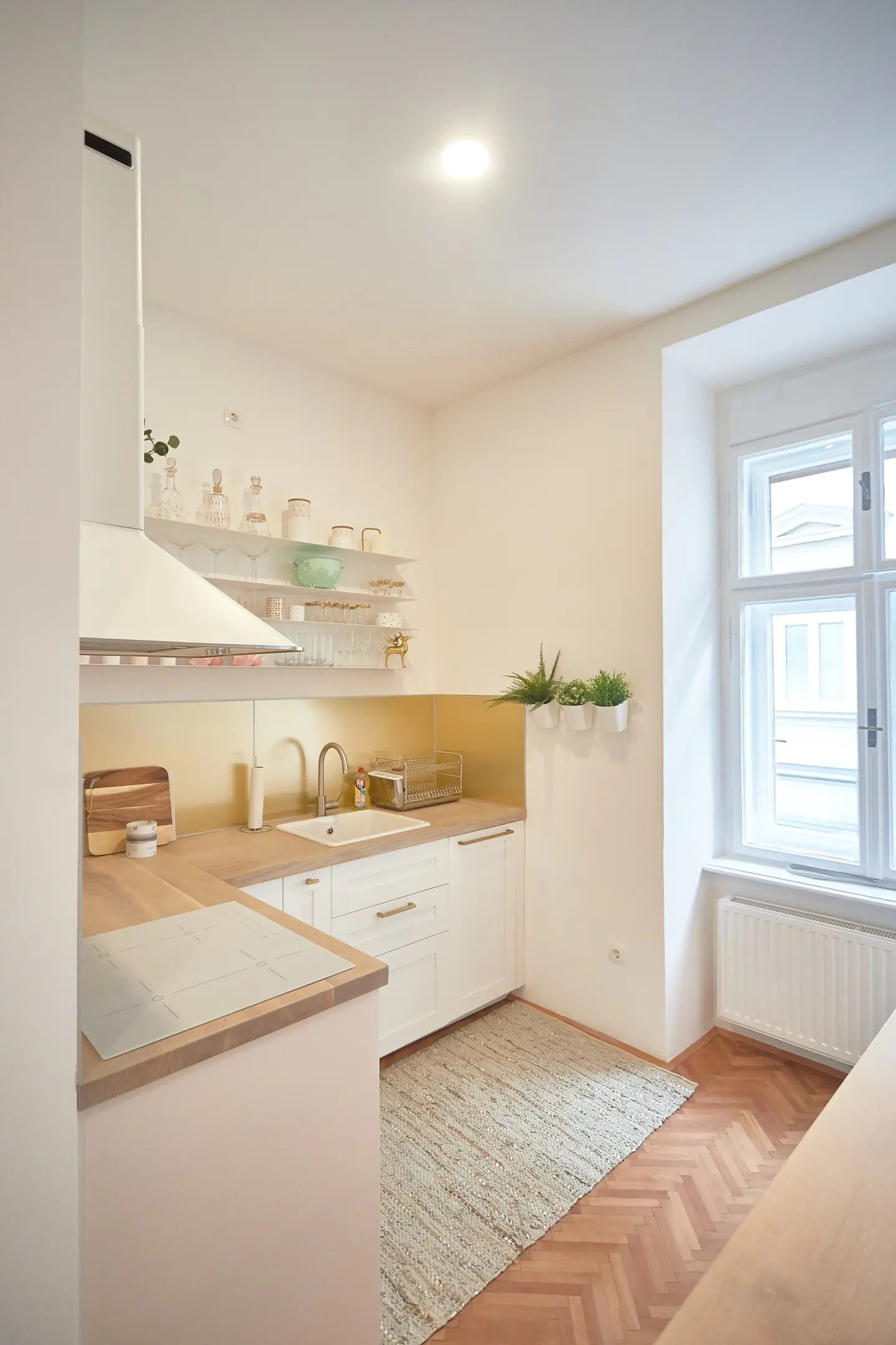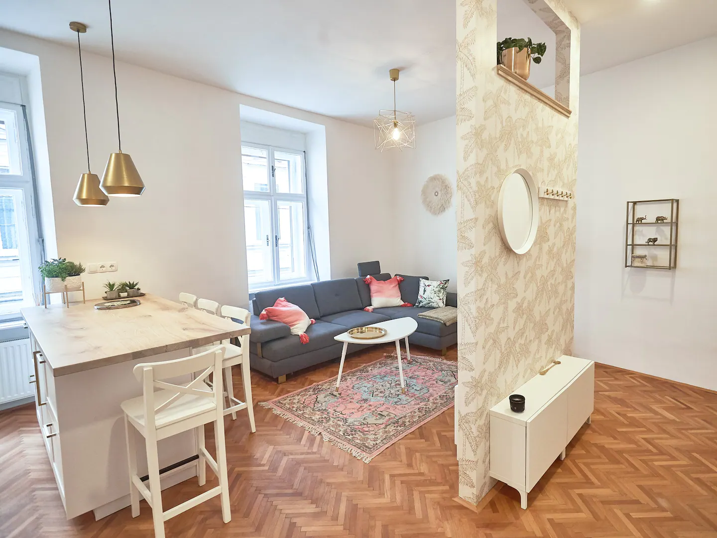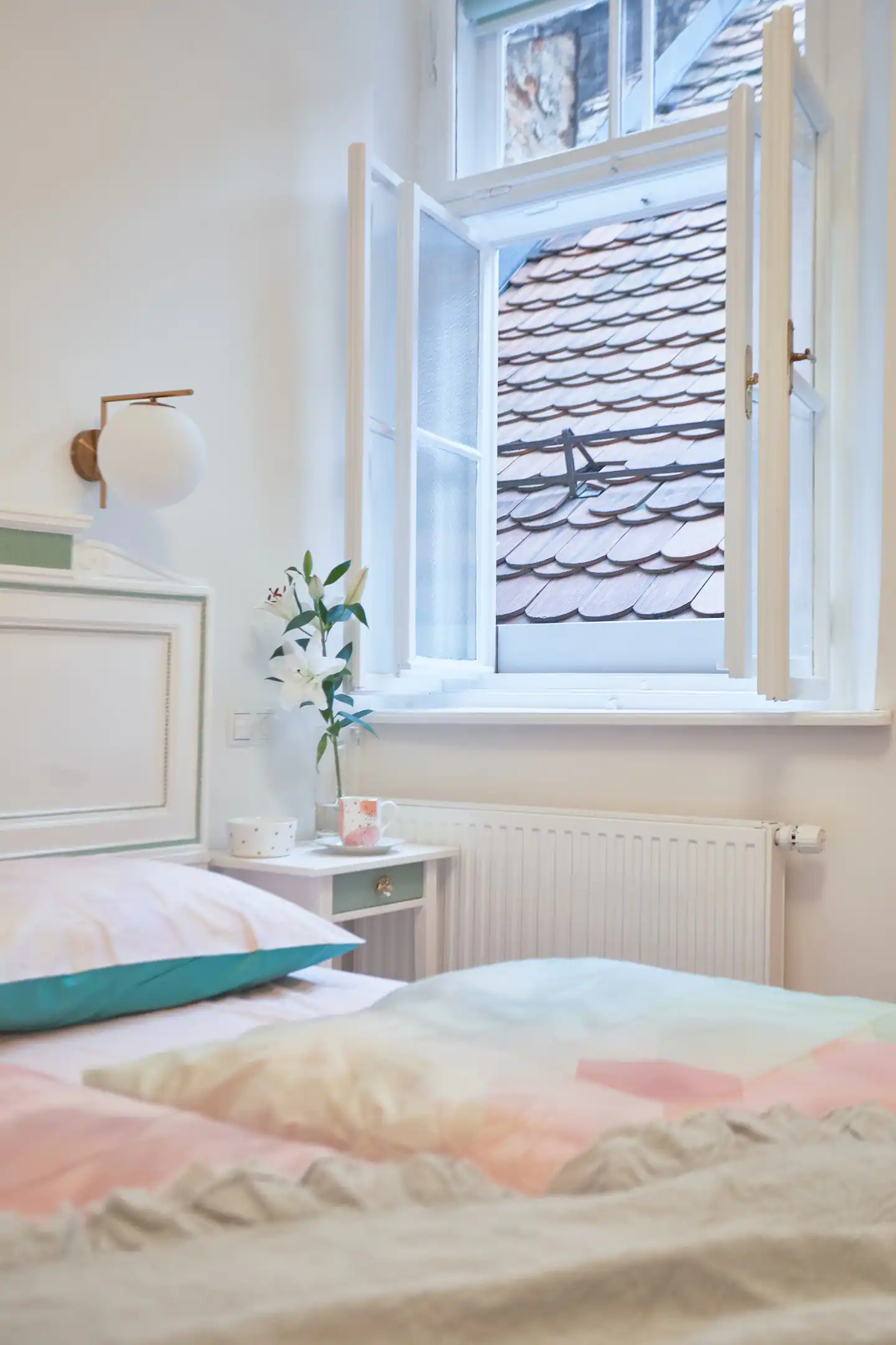This spacious and cozy apartment has a nicely decorated living room area which is connected to a fully equipped kitchen but slightly separated from it with a bar-like dining space. The very special feature of this apartment is an antique bed that was brought from a small fortress-like house in the suburbs of Vienna. Slide back in time and sleep like a Lord in this very unique end enormously big bed.